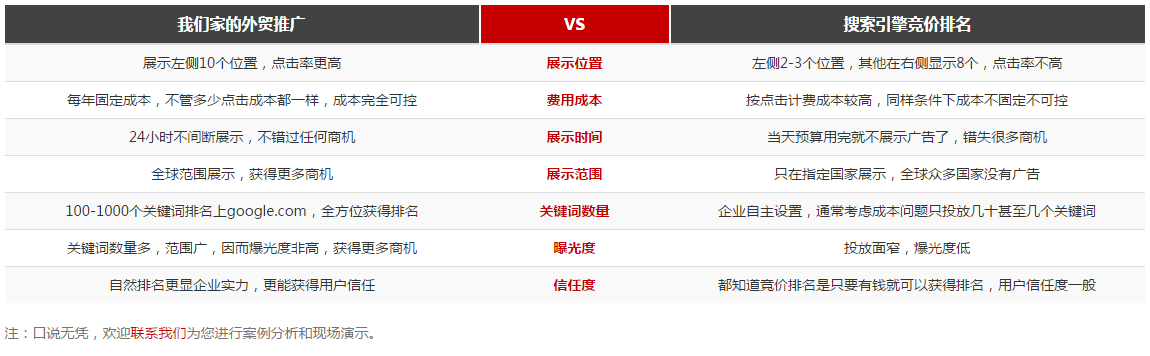 外贸快车产品是基于我公司超过10年的外贸营销技术经验和SEO技术体系所开发。外贸快车承诺确保企业 50至 1000 个产品关键词google.com的全球首页排名,全面提升企业在全球市场的曝光率。